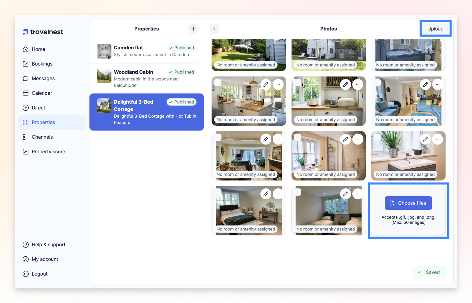 - To upload new photos, look for the upload button – it'll either be at the top right or bottom of the page. Choose the images you want to add from your desktop or mobile device. Your photos will be added automatically to your property gallery.