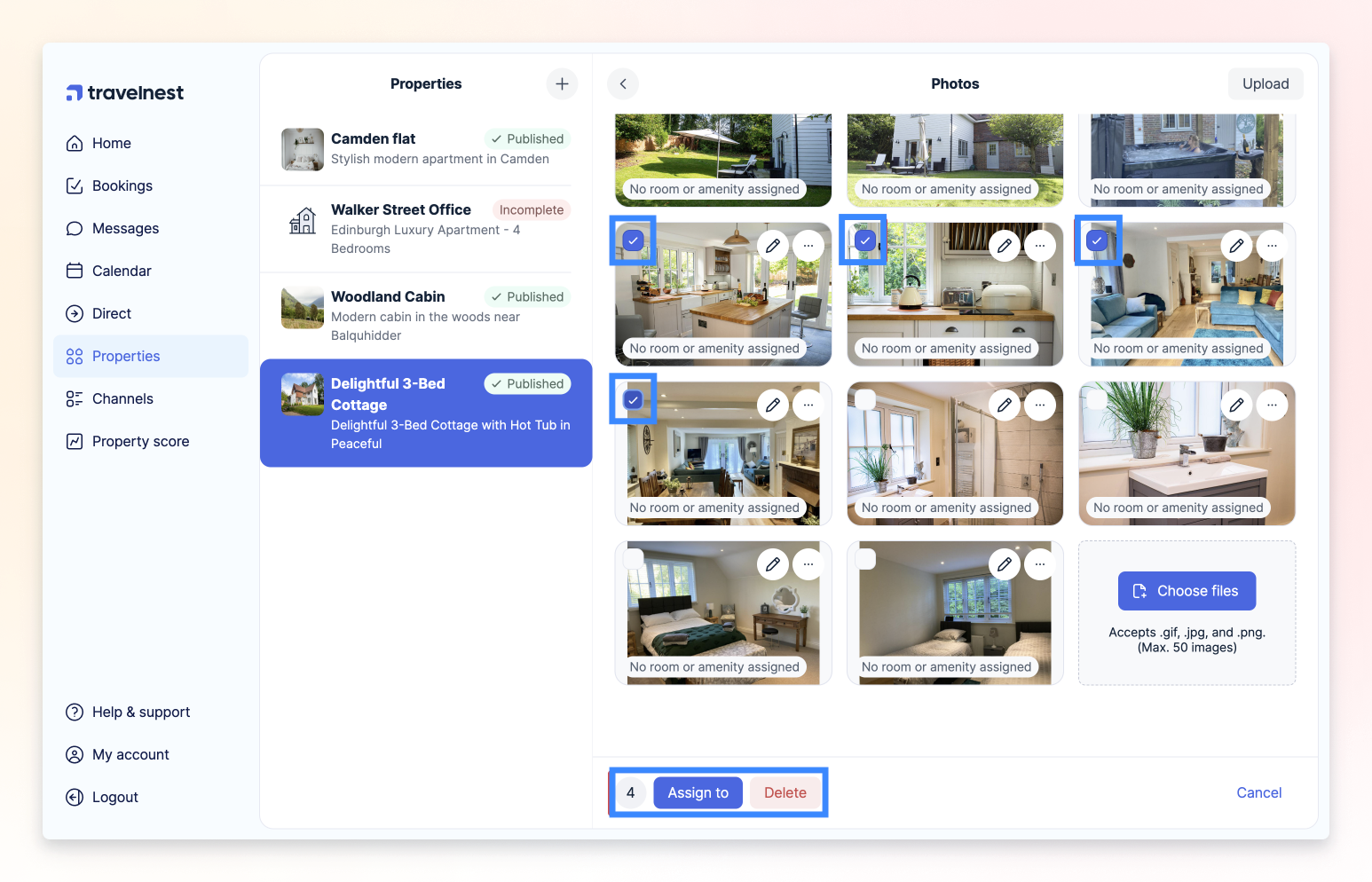 - You can also make changes to multiple photos at once. Just check the boxes next to the ones you want and then choose what you want to do – like assigning a room, amenity or deleting them.