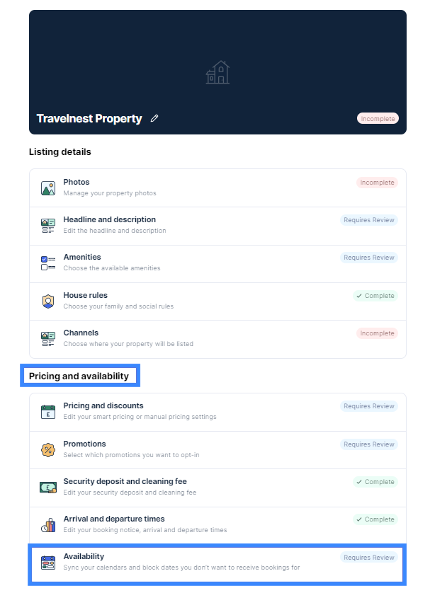 If you’ve just created a Travelnest account and want to sync calendars before your property is published, you can find your calendar under Pricing and availability > Availability.