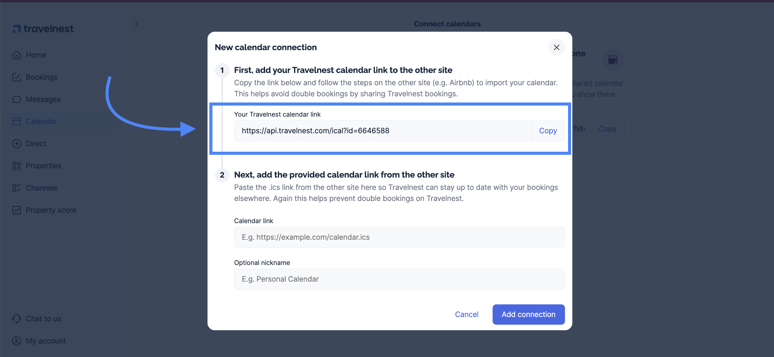4. Copy the Travelnest calendar link — this will be used in the next step to connect your Travelnest calendar with Booking.com:
