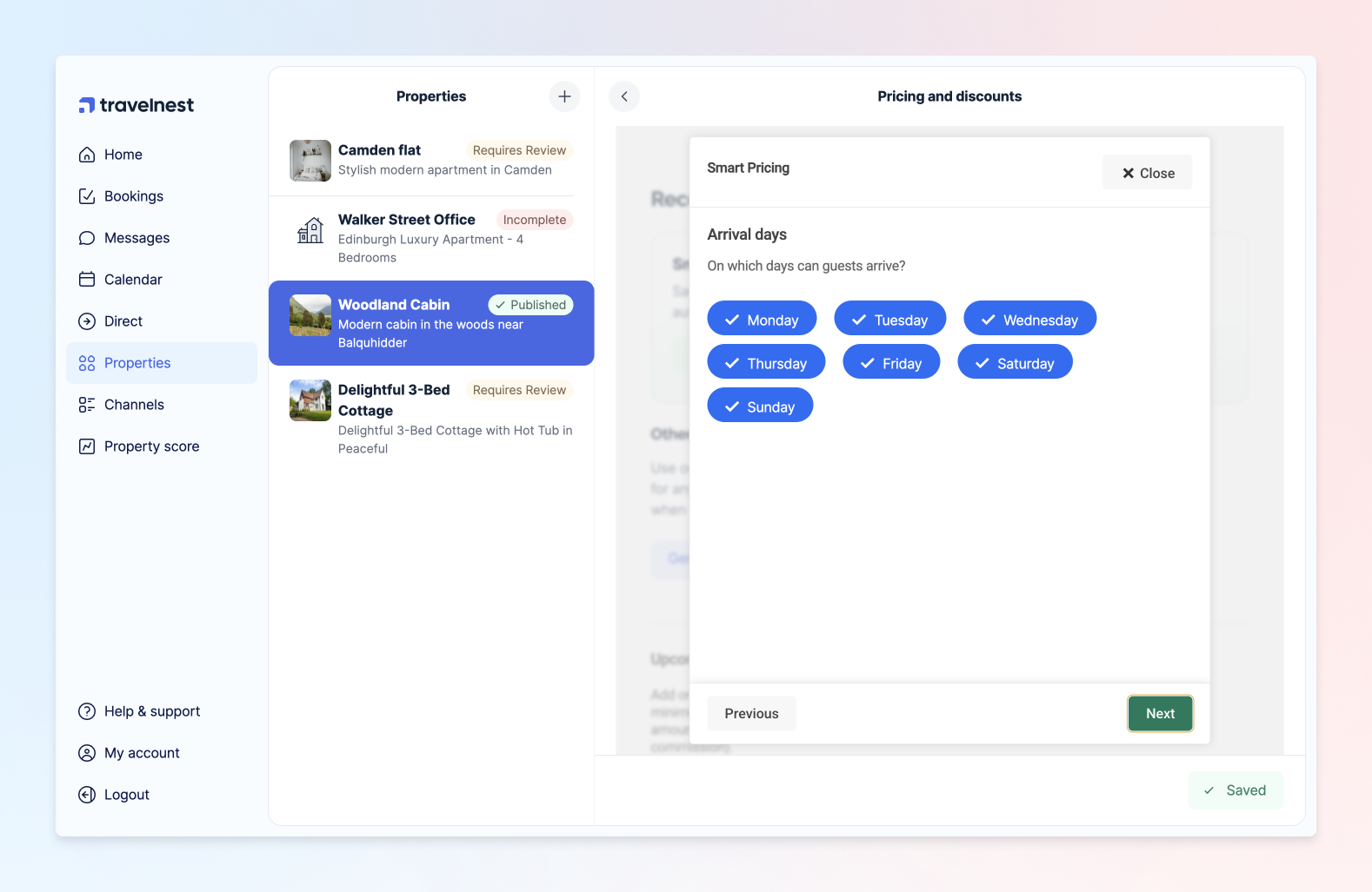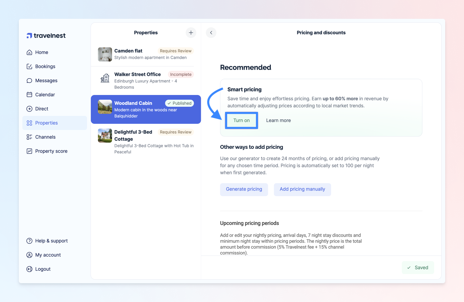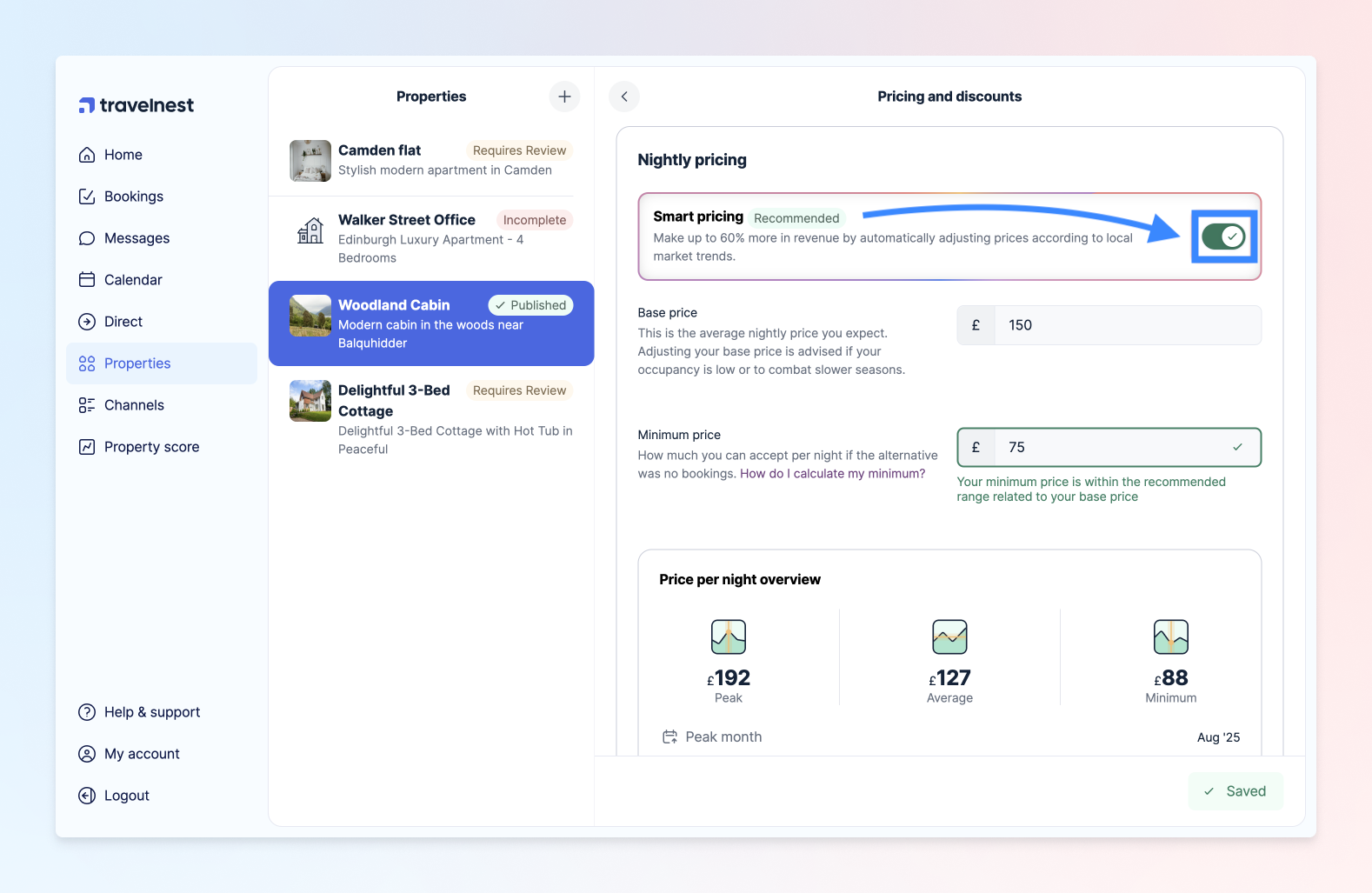 Smart Pricing is a dynamic, data-driven pricing engine that automatically sets personalised, up-to-date nightly rates for your property for the next 365 days. It analyses live market conditions and adjusts your prices to help you stay competitive and attract more bookings — potentially increasing your revenue by up to 60%.