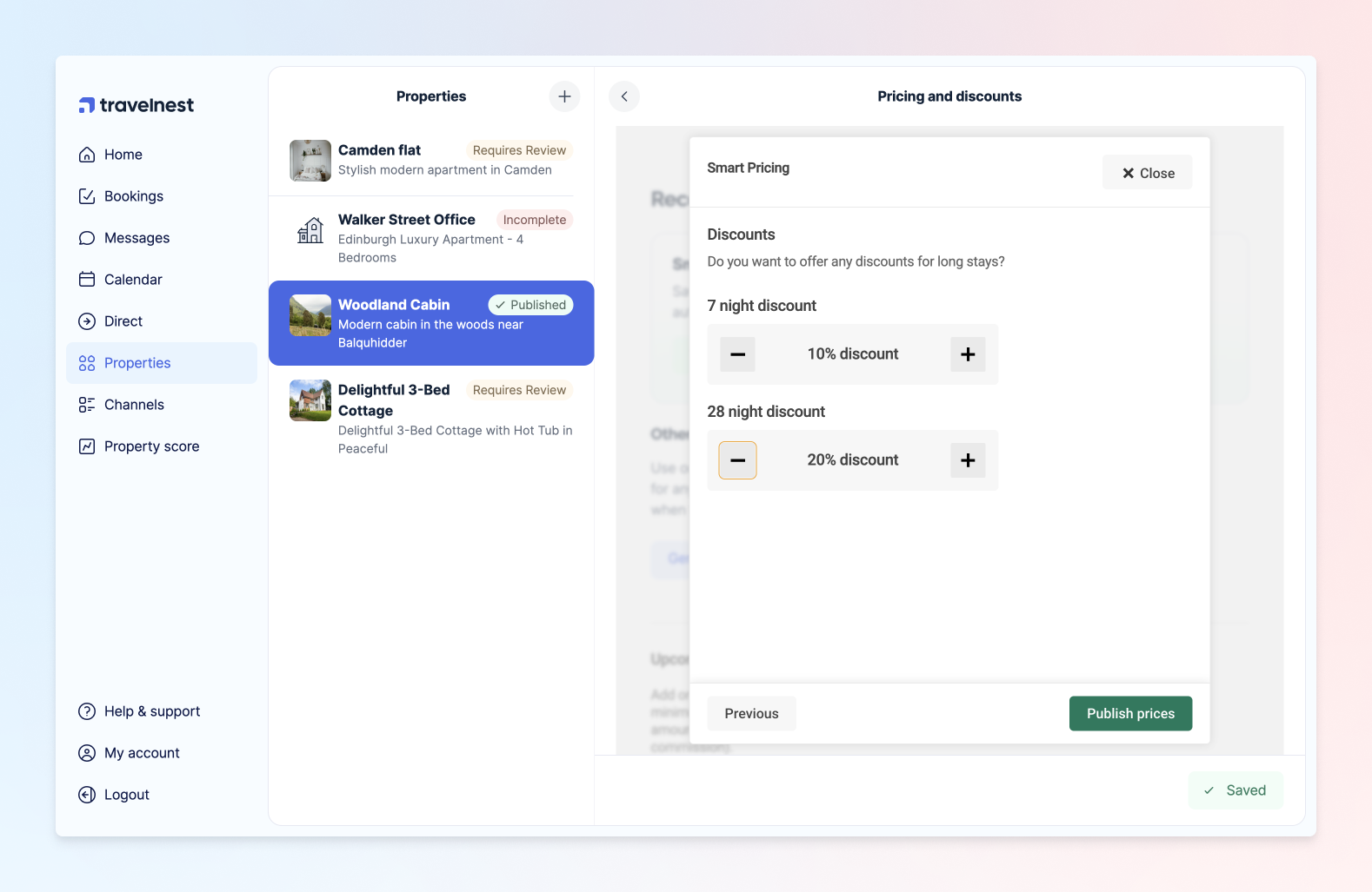 - Use the plus or minus buttons to set the discounts for 7-night or 28-night stays. Then click Publish Prices to activate Smart Pricing for your listing. These settings will apply for the next 12 months under Smart Pricing.