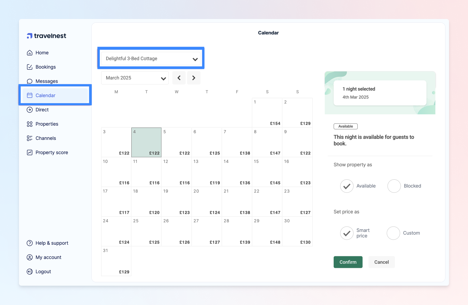 - To view your nightly pricing, head to the Calendar section in the mobile app or web page. Once Smart Pricing is enabled, select your property from the drop‑down menu to see the rates for each night.